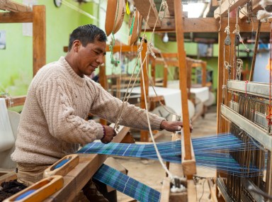 World Fair Trade Tartan on the loom, supporting weavers in Peru, woven with 100% baby alpaca wool.